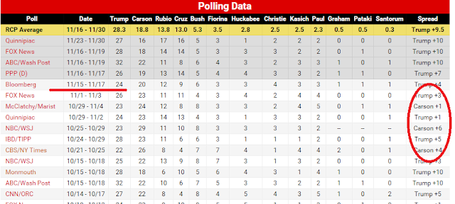 Curiously, that two week period began immediately after a couple of recent polls had shown Carson neck-and-neck with Trump. The red dash on the left shows when the fortnight of silence began and the oval on the right shows the polls that were used to show the current RCP average during that two-week period. Polls since then have shown Trump leading significantly.